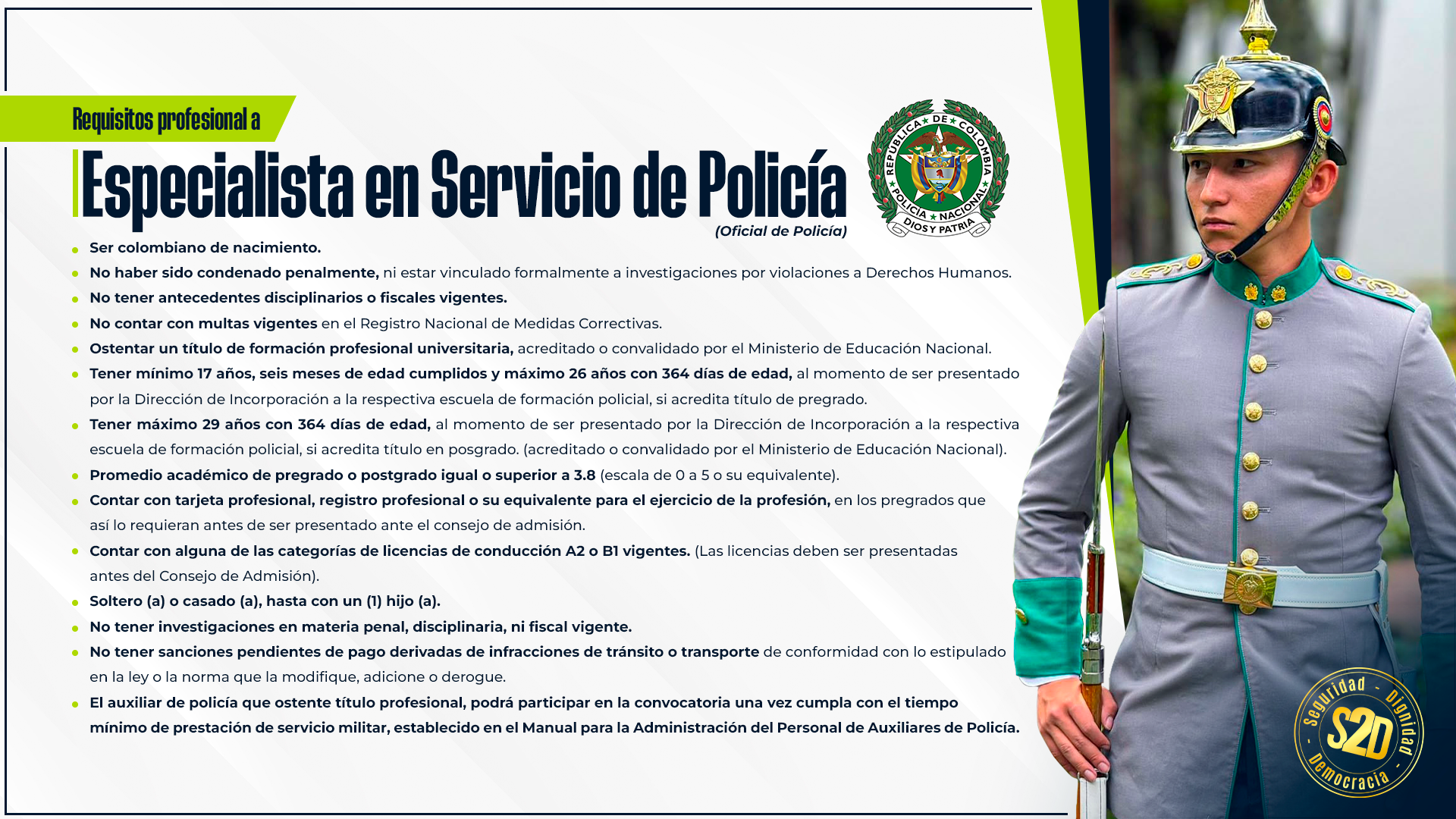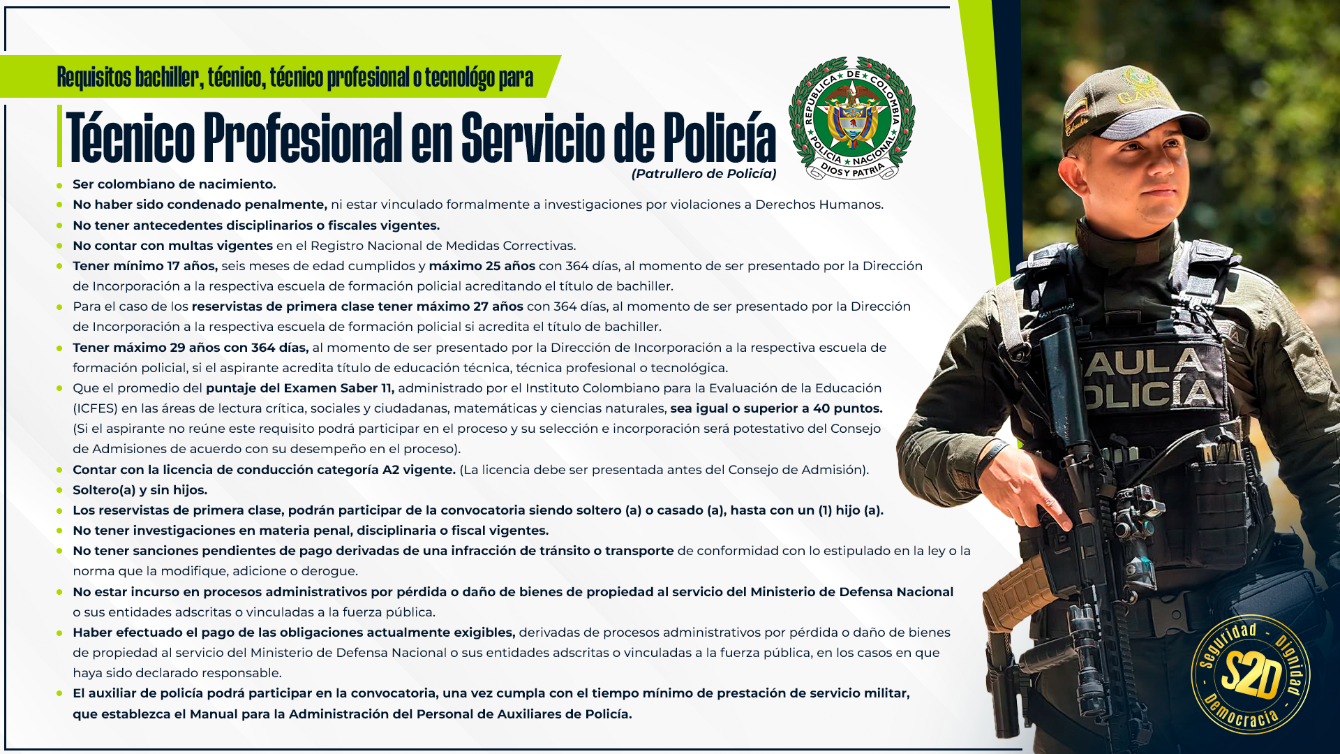 Funcionarios Incorpórate como Patrullero de Polícia Ver más Incorpórate como Administrador Policial Ver más Hazte Auxiliar de Policía Incorpórate a la Policía Nacional IMÁGENES QUE INSPIRAN Hazte patrullero Hazte oficial Hazte auxiliar de policia Colombia profunda Hazte patrullero Hazte oficial Hazte auxiliar de policia Colombia profunda proceso de seleccion Preinscríbete Pasos, costos y recomendaciones Pasarela de pagos Información becas Vamos Sumando Requisitos Auxiliar de policía Bachiller a patrullero de policía Profesional a patrullero de policía Bachiller, técnico profesional o tecnólogo a oficial de policía Profesional a oficial de policía Uniformado, técnico, tecnólogo a oficial Uniformado profesional a oficial No uniformado a oficial canales de atención, TRATAMIENTO DE DATOSDIRECTORIO REGIONALESDE INCORPORACIÓN SOPORTES DE GESTIÓN DOCUMENTAL TRATAMIENTO DEDATOS PERSONALES BENEFICIOSDE SER POLICIA