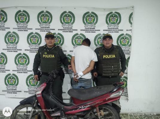La captura se efectúa en el barrio Villanueva del municipio de Tamara Casanare, cuando el presunto ladrón se movilizaba en el automotor y quien al notar la presencia policial trató de huir del sitio. Al capturado de 32 años de edad y de nacionalidad extranjera que fue interceptado por los uniformados una cuadra más adelante se le dio a conocer los derechos como persona capturada y fue dejado a disposición de la Fiscalía de turno por el delito de hurto.
