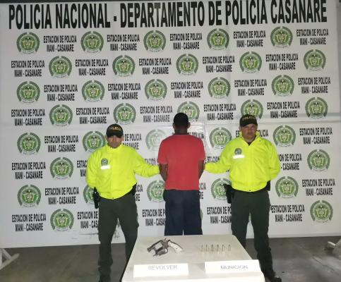 En el sector del puente rio charte de la vereda mundo nuevo del municipio de Mani, fue abordado el hombre por parte de la patrulla para realizarle registro e identificación, cuando se le hallo un arma de fuego tipo revólver calibre 38 con 6 cartuchos, manifestando no tener documentación que permitiera legalidad. Razón por la que se procede a la captura del ciudadano por el delito de tráfico, fabricación o porte de armas de fuego. Finalmente, el capturado junto con el arma incautada fue dejado a disposición de la Fiscalía 17 local de turno por el delito antes mencionado.
