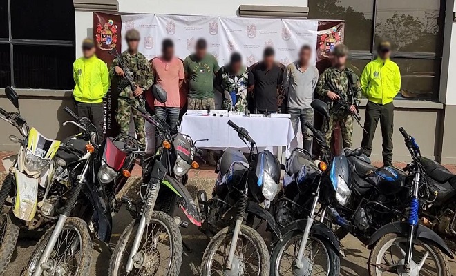 Se les incautaron los siguientes elementos: una granada de fragmentación, dos pistolas, tres revólveres, una escopeta, munición, una radio escáner, cuatro celulares, un morral de campaña y siete motocicletas. Asimismo, de las motocicletas incautadas, una presentaría los sistemas regrabados, una con logaritmos de identificación borrados, y dos reportadas como hurtadas.
