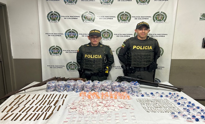 Con esta información, desde la Estación de Policía Barbosa y con el apoyo de una reacción policial, se llegó hasta el lugar donde fueron halladas dos armas de fuego y gran cantidad de estupefacientes así: