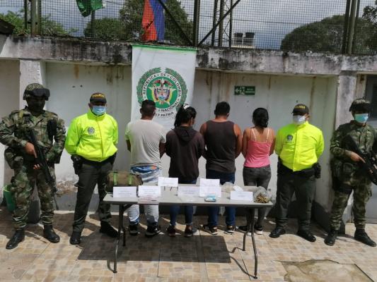 Durante la intervención a esta residencia se lograron materializar cuatro capturas en flagrancia, dos hombres y dos mujeres entre los 20 y 45 años de edad, a quienes se les halló 1.000 gramos de cocaína, 20 panfletos tipo calendario alusivos a las FARC - EP 'Jorge Briceño', ocho cartuchos calibre 38 especial, un arma de fuego tipo artesanal calibre 16 milímetros y un morral tipo militar de primeros auxilios con todos sus elementos, elementos avaluados en seis millones de pesos.
