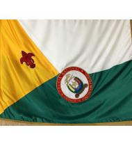 En el centro de la bandera un circulo de color rojo, en fondo blanco con el escudo un estrella de cinco rayos o puntas con dos de ellas hacia abajo y el lema PERSEVERATIA-FIDE-DISCIPLINAN (Perseverancia-Lealtad-Disciplina) y sobre la parte superior en oro un jinete y su equino en posición de salto  representando el deporte ecuestre enmarcado en una de sus disciplinas insignias de la especialidad.
