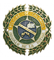 En el cantón diestro va un libro en oro, en el siniestro dos revólveres cruzados en plata. Rodea el escudo una bordadura con la mitad superior en oro y la inferior, en plata. Ambas a manera divisa y lema tienen en sable, aquella: “Policías de Colombia” y ésta “Orgullo de la Patria”. Alrededor del escudo se ve a modo de corona cuatro gajos de laurel, nervados en sable y hacia el interior, frutados en gules, siete veces a la diestra y seis a la siniestra.