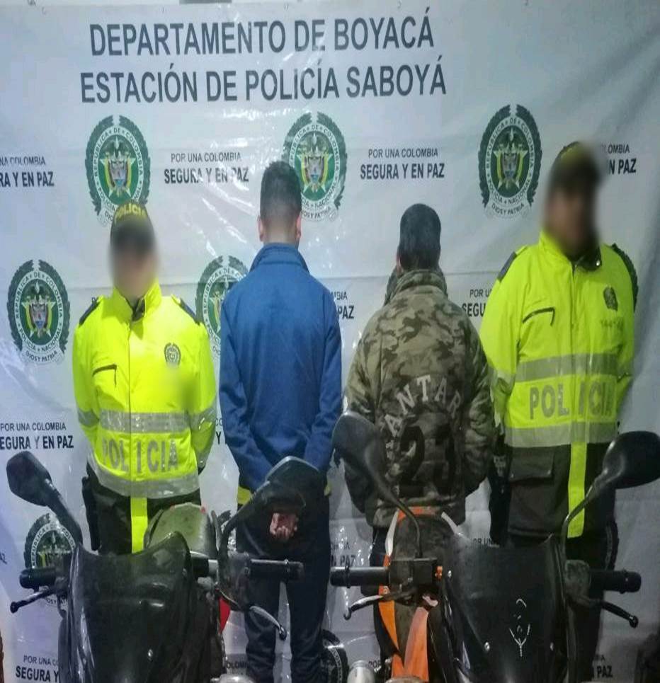 Saboyá. En el despliegue de la estrategia contra el hurto a automotores, unidades policiales del Modelo Nacional de Vigilancia Comunitaria por Cuadrantes, lograron la captura de dos sujetos y recuperación de dos motocicletas de diferentes marcas y modelos.