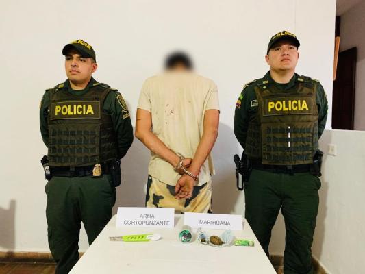 Gracias al trabajo preventivo y acercamiento con la comunidad, realizado por uniformados en el municipio de Barichara, y después de recibir una llamada telefónica, se logra dar captura a un sujeto, quien al parecer habían ingresado a un inmueble y ocasionado daño a un vehículo, al atender el requerimiento por parte del personal uniformados y al solicitar el registro a persona fue hallado en su poder un arma cortopunzante y 08 gramos de estupefacientes.