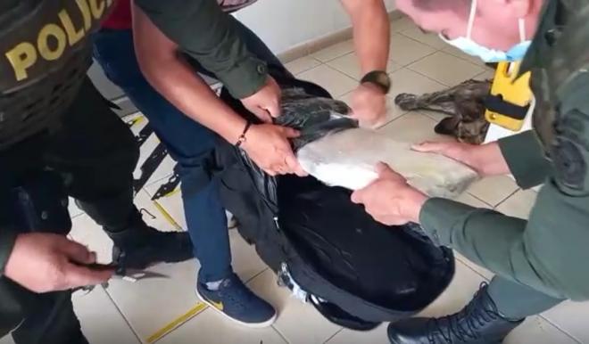 Los uniformados mediante labores de patrullajes y registros a transeúntes, capturaron a un sujeto, con 24 Kilos de marihuana, los cuales estaban ocultos en dos morrales y eran movilizados en la bodega de carga de un vehículo afiliado a una empresa de transporte de carga y pasajeros, la sustancia está avaluada en la suma de $19.200.000 millones de pesos. El capturado en flagrancia junto a la sustancia incautada fueron puestos a disposición de autoridad competente por el delito de fabricación, porte y tráfico de estupefacientes.