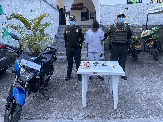 Inmediatamente se realizó el plan candado y en una oportuna reacción se interceptó este sujeto junto con la motocicleta hurtada, los uniformados al realizarle el registro le hallaron en su poder dos armas traumáticas con 10 cartuchos para las mismas, una máscara y un celular reportado como hurtado en las bases de datos de la Policía Nacional.