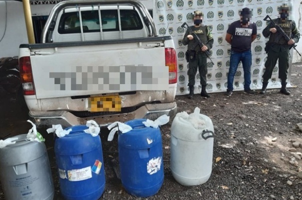El caso operativo se presentó a la altura de la vereda la Cuchara, jurisdicción del municipio de la Gloria, momentos en que se detiene un carro tipo camioneta de cabina con platón, el cual era conducido por una persona, de 33 años, quien transportaba cuatro canecas de 60 litros cada una, de alcoholes primarios y secundarios para la elaboración de estupefaciente.