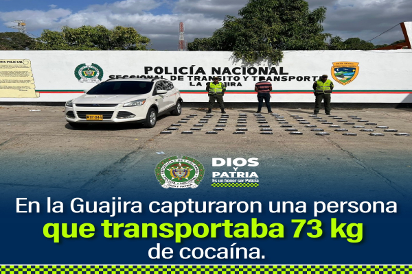 La Seccional de Tránsito y Transporte del Departamento de Policía Guajira en procedimiento adelantado dentro del “Plan Cazador e Incautación de Drogas”, capturó en las últimas horas a una persona que transportaba 73 kilos de clorhidrato de cocaína en zona rural de Dibulla.