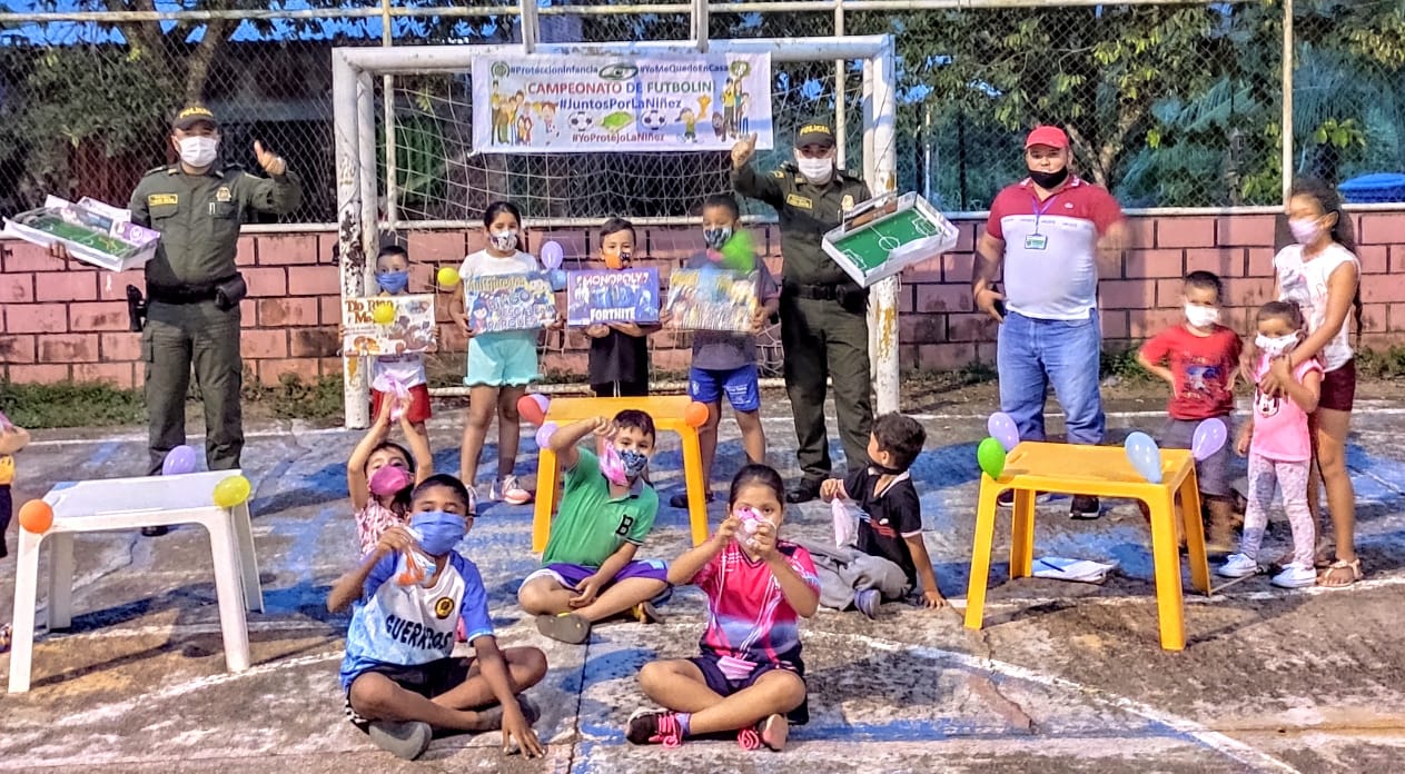 Teniendo en cuenta, que durante esta época de pandemia los infantes y adolescentes se encuentran en las casas y tienen tiempo libre, los policiales llegaron con los futbolines a diferentes barrios y veredas del municipio, implementando un campeonato que denominaron “Juntos por la Niñez”, para que a través del juego utilizaran sanamente el tiempo libre y fortalecieran los valores, principios y así rechazar la violencia en sus diferentes formas garantizando su protección.