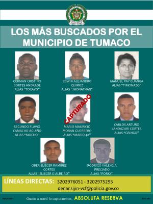 Actualmente la Policía Nacional busca en el municipio de Tumaco a: German Cristino Cortes Andrade alias “Tocayo”, Edwin Alejandro Quiroz alias “Jhonathan", Manuel Pay Guanga alias “Timonazo”, Segundo Flavio Camacho Aguiño alias “Mocho”, Ober Eliecer Ramírez Cortes alias “Eliecer O Albeiro”, Carlos Arturo Landázuri Cortes alias “Gringo” y Rodrigo Valencia Preciado alias “Porky”, por delitos relacionados con concierto para delinquir y homicidio; mientras que en el departamento de Nariño, se busca a Carlos Muñoz Salcedo alias “Carlos Largo” por el delito de homicidio doloso y porte ilegal de armas de fuego.