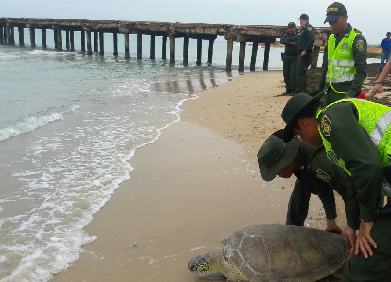 En los controles que se vienen realizando para evitar el tráfico de flora y fauna nativa del departamento de La Guajira, el Grupo de Ambiental y Ecológica de la Policía Nacional logra la captura de dos personas de 20 y 40 años de edad y el rescate de diez tortugas marinas de especie carey y verde, que pensaban ser sacrificadas y posteriormente comercializadas en la ciudad de Uribia.
