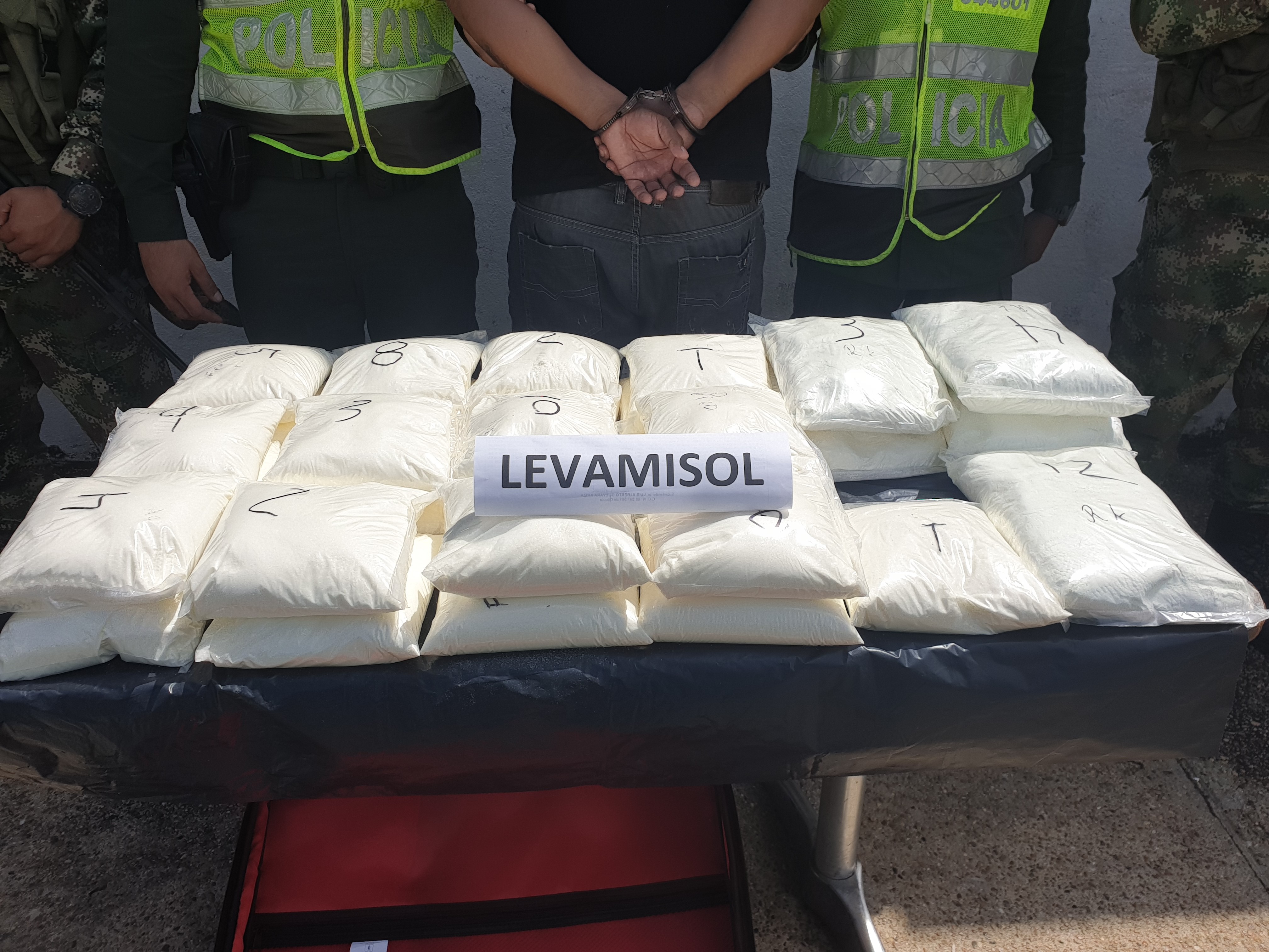 En Cumplimiento al Plan Choque Fase IV “Construyendo Seguridad”, profesionales de la Policía Nacional adscritos a la Estación de Policía Aeroportuaria, en una acción conjunta y coordinada con el Ejército Nacional, la Armada Nacional y el Grupo Aéreo del Amazonas del departamento del Amazonas en la Terminal Área Alfredo Vásquez Cobo, se incautaron más de 20 kilos de una sustancia de color blanca, conocida como Levamisol, los cuales fueron detectados por los uniformados durante las actividades de registro y control que se realizan en el interior del aeropuerto local.