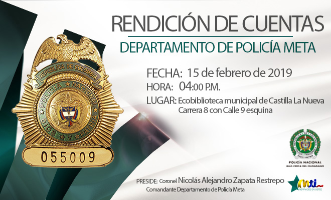 Con el propósito de presentar el balance de la gestión realizada durante el año 2018, el Comando de Departamento de Policía Meta realizará audiencia pública de ‘Rendición de Cuentas’ el próximo viernes 15 de febrero, a partir de las 4:00 de la tarde, en Ecobiblioteca Municipal de Castilla la Nueva, ubicada en la Carrera 8 con calle 9 Esquina del barrio Centro.