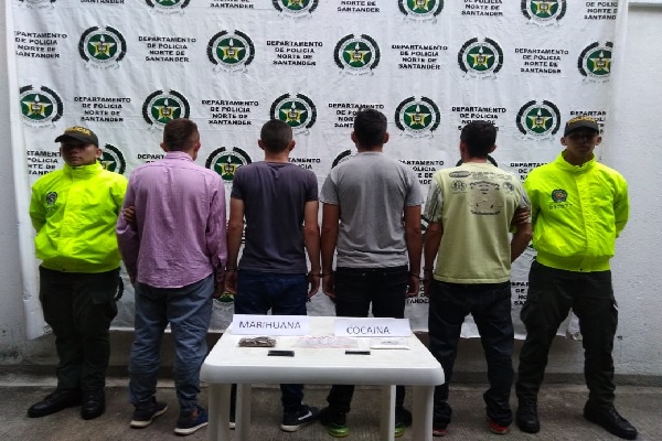Gracias al despliegue de las capacidades de Investigación Criminal e Inteligencia Policía y las coordinaciones con la Fiscalía General de la Nación, en las últimas horas mediante diligencias de registro y allanamiento de manera simultánea diferentes inmuebles del municipio de Ábrego se logró la captura de tres personas quienes se encontraban solicitados mediante órdenes de captura emanadas del Juzgado Noveno de Garantías de Cúcuta, por el delito de tráfico, fabricación o porte de estupefacientes y otra persona quien lideraba esta organización y a quien se le hallaron en el operativo 46 gramos de marihuana, 35 gramos de clorhidrato de cocaína.