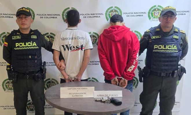 En una intensa persecución registrada por los barrios Industrial, Las Delicias y Brisas de Guatiquía, uniformados del Modelo Nacional de Servicio de Policía hicieron efectiva la captura en flagrancia de dos hombres de 19 y 22 años, quienes minutos antes habían intimidado con un arma de fuego a dos mujeres para despojarlas de sus pertenencias y huyeron del lugar en motocicleta.