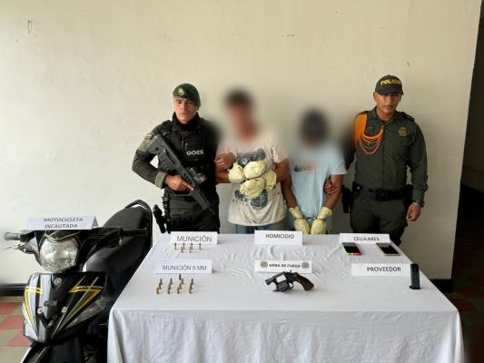 La captura se presentó cuando estas personas presuntamente habrían atentado contra la vida de una mujer de 48 años y su hijo de 26 años de edad, en el barrio Plaza Vieja del municipio de Ansermanuevo. En desarrollo de labores de patrullaje, los uniformados escuchan varias detonaciones y en una rápida reacción observan a dos personas que emprenden la huida en una motocicleta, realizando la persecución, logrando la captura de estas personas.