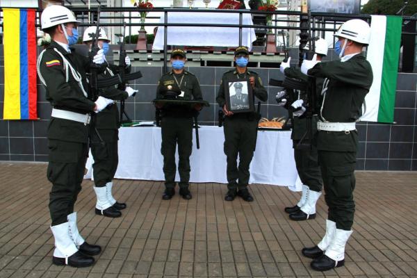 La señora Coronel Sandra Bibiana López Duque, Directora de la Escuela dio paso al sentido homenaje por la pérdida de nuestro compañero, el señor Patrullero Carlos Andrés Rincón Martínez de 33 años, quien fue egresado de este plantel de formación policial, graduándose junto con sus compañeros en el año 2012, como Técnico Profesional del Servicio de Policía, en el curso Nro 045.