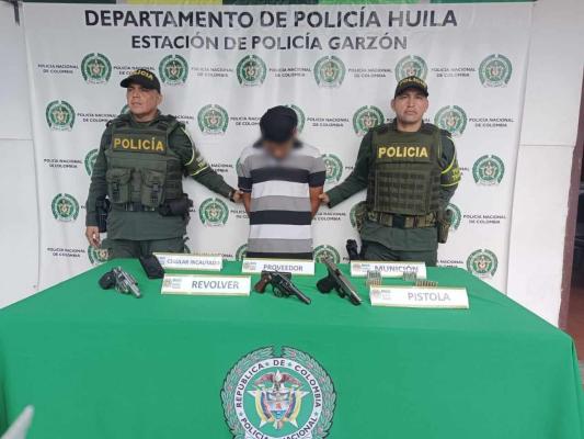 El sujeto fue requerido por las unidades de Tránsito en la vereda 'Puerto Seco' jurisdicción del municipio de Gigante, sobre la ruta 45, al registrar los elementos que llevaba consigo, se hallaron en su bolso de mano: dos revólveres y una pistola.