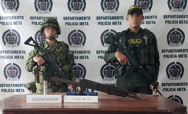 Por último, en la vereda Angosturas del municipio de Lejanías, nuestras unidades de la Vigilancia con apoyo de tropas del Ejército, le quitaron un fusil marca AK-47 a los grupos armados organizados que delinquen en la zona, el cual fue encontrado dentro de una lona hallada a un costado de la vía, en donde habría sido abandonada por sujetos que huyeron al percatarse de la presencia policial. Siendo dejado a disposición de la Fiscalía 20 seccional de Granada.