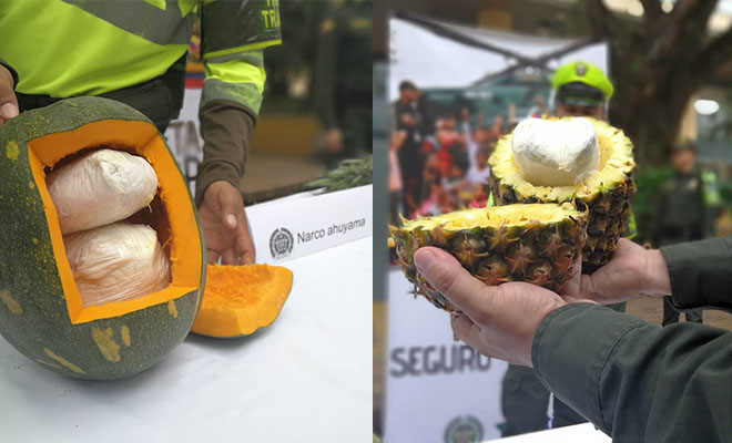 Una vez más la capacidad e inteligencia intuitiva de policías de Tránsito y Transportes fueron la “piedra en el zapato” de los narcotraficantes, al detectarles dos ‘narco piñas’ y una ‘narco ahuyama’, que con cuatro kilos de base de coca habían enviado en un bus servicio público que cubría la ruta San José del Guaviare – Bogotá.