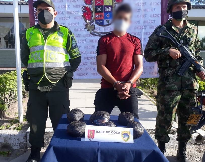 La captura se dio el día de ayer miércoles 20 de enero en horas de la tarde, donde unidades de la seccional de Tránsito y Transporte junto con el personal de Batallón Infantería No. 27, adelantaban registros a vehículos y motocicletas cuando fue detenido un hombre de 29 años de edad y al verificar minuciosamente la motocicleta en la que se transportaba, fue hallada una caleta en la parte lateral de la misma, encontrando un total 6 paquetes prensados de base de coca con un peso de 3.300 gramos. De inmediato los uniformados le dan a conocer los derechos que tiene como persona capturada.
