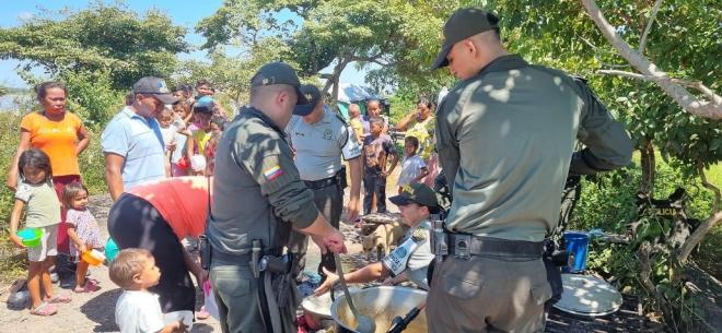Con el objetivo de aportar un granito de arena en la construcción de una vida digna y garantes de los derechos de los Niños, Niñas y Adolescentes, los uniformados llegaron a estos resguardos, donde dieron inicio a la actividad con la socialización de los deberes y derechos de los más pequeños del hogar, logrando sensibilizar a más de 65 padres de familia sobre las consecuencias legales que conlleva incurrir en los delitos que afecten la integridad Niños, Niñas y Adolescentes; posteriormente, dieron paso a la olla comunitaria, donde compartieron un almuerzo rodeados de risas, felicidad y las ocurrencias de los niños que sin duda quedaran plasmados para siempre en el corazón de los policiales; finalmente, hicieron la entrega de mercados, ropa y elementos de aseo a las diferentes familias pertenecientes a esta comunidad quienes con una sonrisa agradecieron el abnegado trabajo de la institución.
