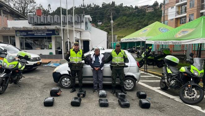 Gracias a la ubicación de un puesto de control por parte de uniformados adscritos a la Seccional de tránsito y Transporte de Nariño, se logró la detención de un ciudadano de 48 años de edad, por el delito de fabricación, tráfico y porte de estupefacientes, esta persona fue capturada sobre la vía Pasto - Mojarras, sector Cano Bajo, cuando se movilizaba en un vehículo de servicio particular transportando gran cantidad de estupefacientes.