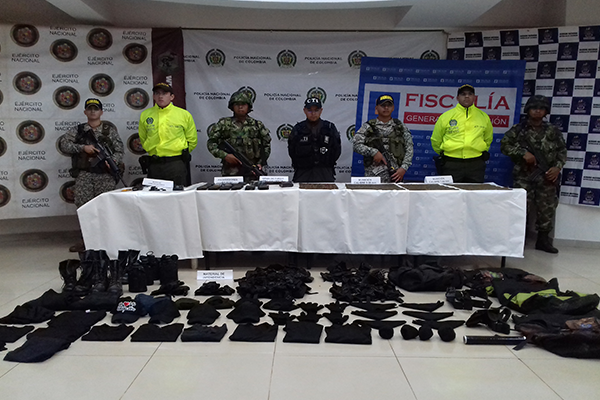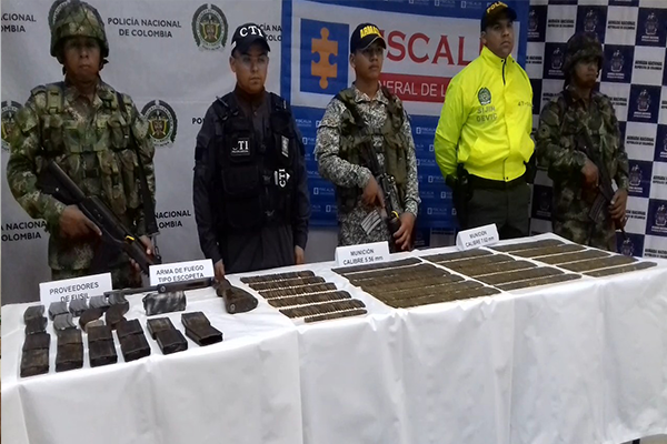 Bajo la coordinación de la Fiscalía Primera Especializada de Puerto Carreño, se logra el hallazgo de una Escopeta calibre 12 mm, 21 proveedores de diferentes calibres, 610 cartuchos calibre 7.62, 1050 cartuchos calibre 5.56, 338 cartuchos calibre 7.62 (AK) material de intendencia entre ellas cuatro pares de botas militares, cuatro chalecos multipropósito, tres chapuzas tipo piernera, cinco cantimploras, seis pañoletas, cuatro reatas, tres gorras, 11 buzos, indumentaria civil, cuatro pasamontañas, tres morrales civil, una silla táctica, cuatro pares de guantes, un guardamano para fusil Galil, así como elementos de comunicación un radio ICOM, un cargador, tres antenas, dos baterías.