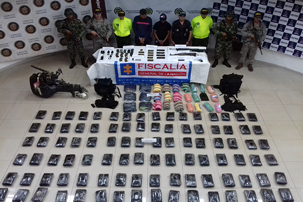 Como resultado del trabajo conjunto y coordinado por la Policía Nacional, Armada Nacional, Ejército Nacional y el CTI de la Fiscalía, se llevó a cabo una nueva operación que permitió la captura de dos sujetos de nacionalidad venezolana y la incautación de más de 108 kilos de marihuana, así como material de guerra (munición), material de intendencia y armamento, avaluados en más de 132 millones de pesos.