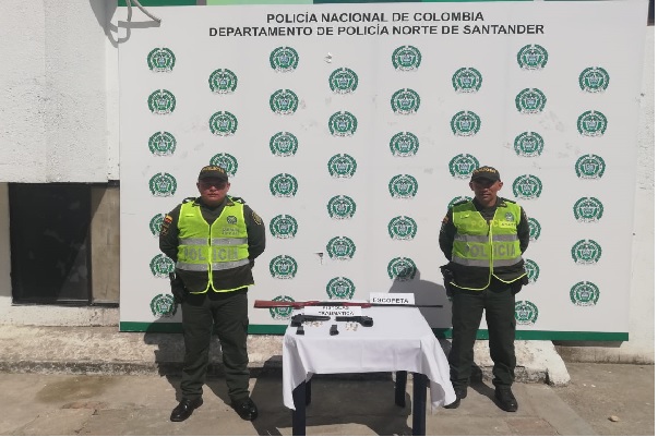 En actividad simultánea en el casco urbano del municipio, se realiza la incautación de 1 escopeta calibre 10 milimetros marca Italy, una pistola de fogueo marca Italy y una marca SWISS ARMS, la cual quedan a disposición del Comando de Departamento Norte de Santander.
