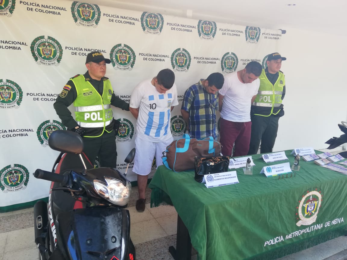 Los capturados fueron identificados como Jhoan Sebastián Lozada Quesada de 21 años de edad, Edgar Andrés Perdomo Rodríguez de 28 años de edad, ambos naturales y residentes en los barrios Cándido y Santa Inés de Neiva; y Lionia Alirio Viveros Gordillo de 35 años de edad, natural de Pasto – Nariño y residente en el barrio Puertas del Sol de esta localidad.