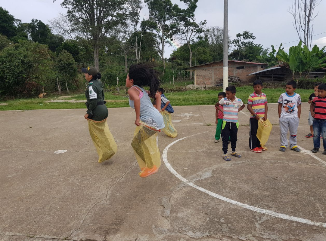 Recuperando los juegos tradicionales como carrera de costales, carretilla y saltando el laso, realizamos una jornada de diversión y recreación con los niños que son el futuro del Huila.