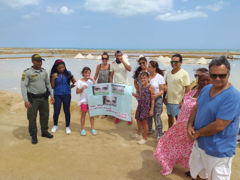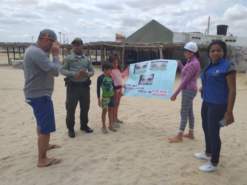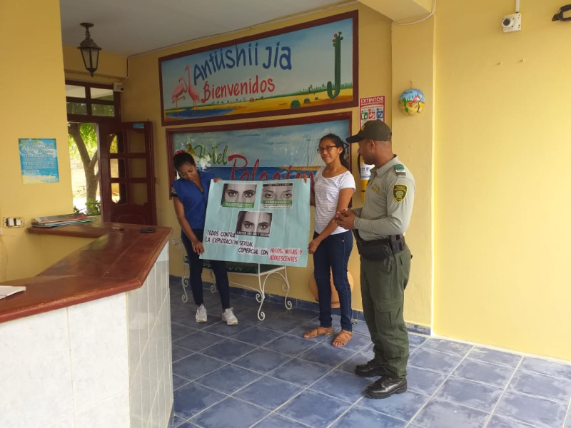 Nuestros uniformados de la Policía de Turismo y Patrimonio Nacional de la Guajira, visitan establecimientos comerciales brindando a los trabajadores, turistas y demás población flotante, la información sobre los flagelos que atentan contra la niñez enfocados a la explotación sexual y trata de personas. Con esta iniciativa buscamos vincular a toda la comunidad para que hagan parte de una cadena de información a nivel nacional. Con ello se quiere generar de manera considerable la protección de los niños, niñas y adolescentes, suministrando ambientes sanos y saludables que aporten a su crecimiento y desarrollo en un contexto social.