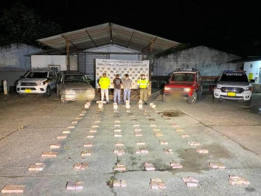 La Policía Nacional de los colombianos en el desarrollo de una acción ofensiva institucional contra el tráfico local de estupefacientes, logró en las últimas horas en vía nacional entre la ciudad de Villavicencio y el municipio de Granada, sector La Nohora, la captura de dos hombres y la incautación de 95 kilogramos de base de coca y 4 kilogramos de bazuco, los cuales fueron hallados al interior de dos vehículos tipo campero en la modalidad de ‘caleta’.