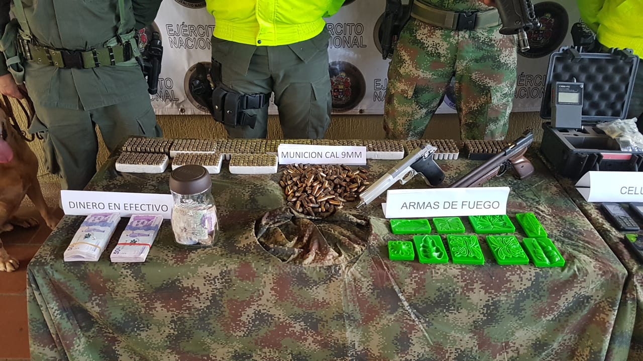 Gracias al trabajo efectuado por investigadores judiciales de la seccional de investigación criminal (SIJIN) y con el apoyo de la Fiscalía General de la Nación, fueron efectuadas cuatro diligencias de allanamiento en la vereda San Marcelino zona rural de este municipio, logrando la incautación de 12 Millones de pesos, 780 Cartuchos cal 9mm, 49 Gramos de marihuana, 46 kilogramos de Pasta Básica de Coca, 7.8 Kilogramos de Clorhidrato de Cocaína (23 mil dosis), un arma de fuego tipo Pistola cal 22mm, un arma de aire comprimido y Elementos de comunicación.
