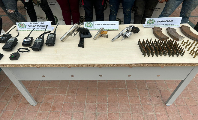 Se incautaron tres armas de fuego, 135 cartuchos de diferentes calibres, cinco radios de comunicación, una motocicleta, un celular y cuatro agendas con información importante.