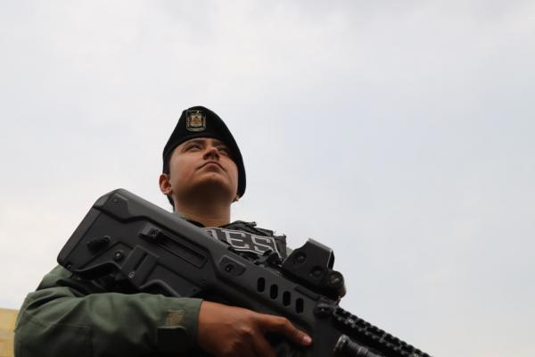 Además de portar de forma permanente el fusil Tavor 21, de aproximadamente cinco kilogramos, que acompañados de toda la munición táctica, hacen que la patrullera Leidy Lizarazo porte un promedio de veinte kilos de elementos de combate añadidos a su cuerpo. Con pistola en pierna, y proveedores de munición brasileña, se levanta a muy tempranas horas a manejar la camioneta de doble tracción dónde moviliza a los compañeros de intervención.