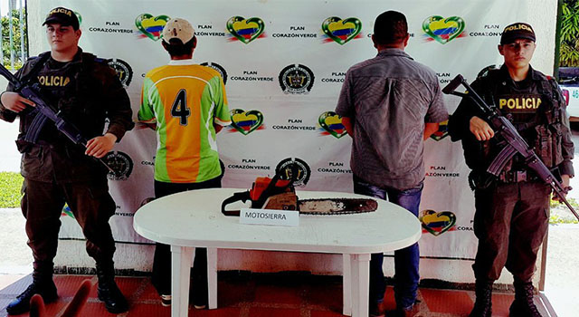 Las unidades del Modelo Nacional de Vigilancia Comunitaria por Cuadrantes que llegaron al lugar, encontraron a dos hombres, de edades 43 y 56 años de edad, cometiendo el delito de ilícito aprovechamiento de los recursos naturales renovables, con una motosierra, siendo dejados a disposición de la Fiscalía 15 local de Puerto Lleras.