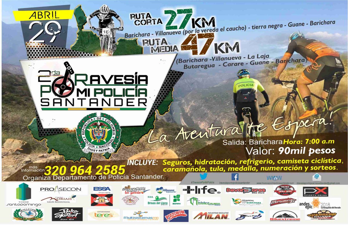 El Departamento de Policía Santander, invita a toda la comunidad y a los deportistas extremos de Colombia a la segunda versión del evento ciclístico denominado “segunda travesía por mi policía Santander”, este próximo 29 de abril de 2018 a partir de las 07:00 de la mañana, partiendo desde el parque principal del municipio. Este evento tiene como finalidad recaudar fondos para la Asociación de Obras Sociales de la Policía Nacional, la cual busca ayudar con mano tendida y corazón dispuesto a los uniformados más necesitados y sus familias.
