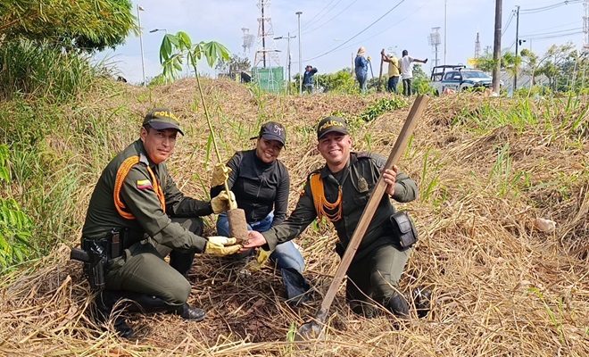 En un acto cargado de compromiso, amor por la tierra y responsabilidad social, la Policía Nacional, a través de la Seccional de Carabineros y Protección Ambiental del Departamento de Policía Magdalena Medio, en articulación con la Secretaría de Medio Ambiente, desarrolló una significativa jornada de ornato, embellecimiento y siembra de 150 árboles en los alrededores del Coliseo Luis F. Castellanos y en el sector de la Ciénaga Miramar del Cristo Petrolero.