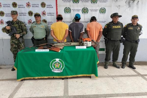 Los tres ciudadanos capturados, entre ellos 2 del municipio de ACHI del departamento de Bolívar y el otro de la capital santandereana, fueron puestos a disposición de la autoridad competente y tendrán que responder por los delitos de aprovechamiento ilícito de recursos naturales no renovables y tráfico, fabricación y porte de armas de fuego.