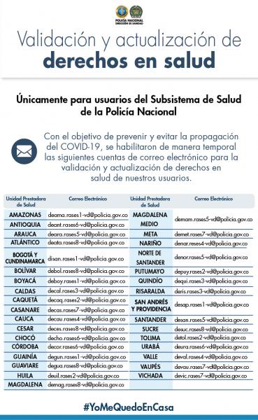 Como una de las medidas para prevenir la propagación de la enfermedad por COVID-19, la Dirección de Sanidad ha dispuesto de manera temporal, correos electrónicos para realizar el trámite de validación y actualización de Derechos en Salud. De esta manera los usuarios deben enviar la documentación completa, escaneada y diligenciada de acuerdo a los requisitos que puede consultar aquí